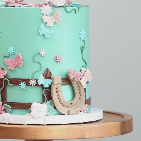 A tall turquoise fondant cake designed with graceful handmade flowers, butterflies, and flowing vines. A fondant horseshoe evokes the horse paddock theme with subtle charm