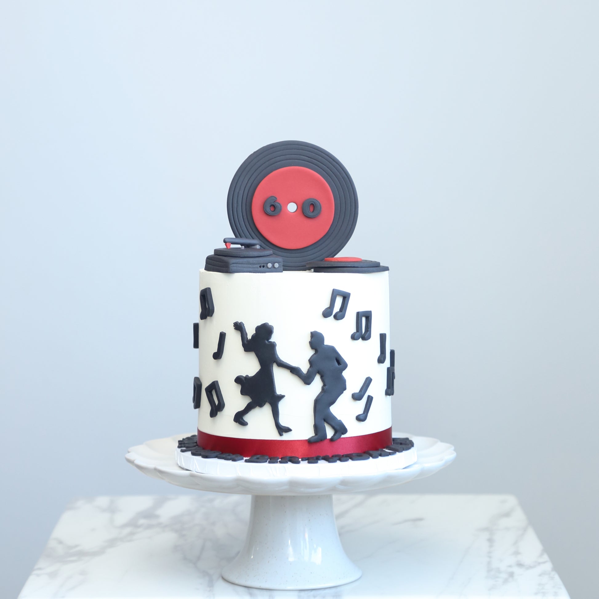 Striking monochrome cake with dancing silhouettes, musical notes, and a vinyl turntable topper. Celebrates rhythm and movement—ideal for dance recitals, music lovers, or retro-themed parties with flair