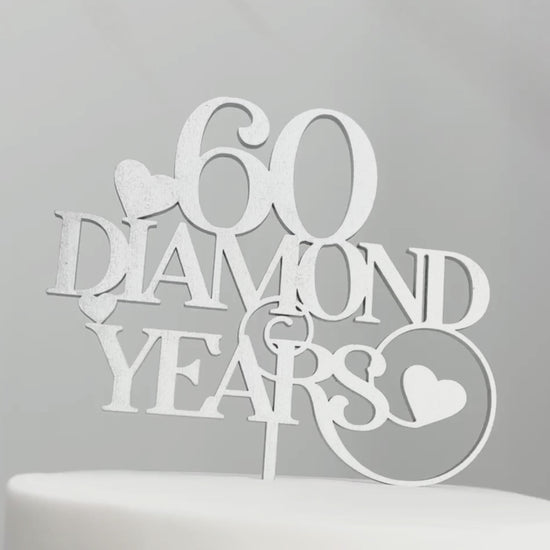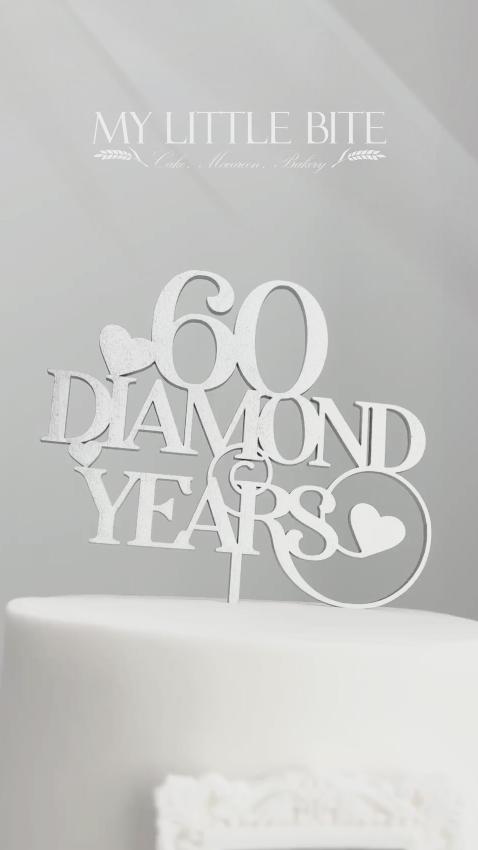 A bespoke two-tier anniversary cake honouring sixty diamond years of love and devotion. Featuring a hand-marbled base, crisp white top tier, and delicate sugar florals in ivory and silver. Finished with a framed edible photograph and a custom topper, this elegant centrepiece blends craftsmanship with heartfelt celebration